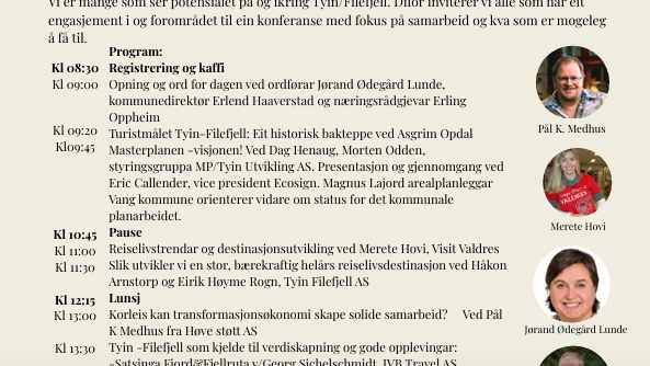 Filefjellkonferansen 2026 - moglegheiter og samarbeid Vi har gleda av å invitere deg til Filefjellkonferansen 2026 - ein møteplass der aktørar og representantar frå reiseliv, næringsliv, kommunar, fritids... Publisert 24.02.2026 kl. 09.38