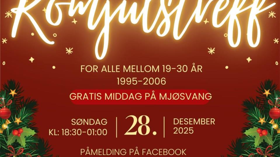 Romjulstreff for unge vaksne i Vang Er du mellom 19 og 30 år og heime i romjula? Då må du bli med på ein kjekk kveld med gratis middag, god stemning og sjansen til å møte nye og gamle ve... Publisert 16.12.2025 kl. 09.27