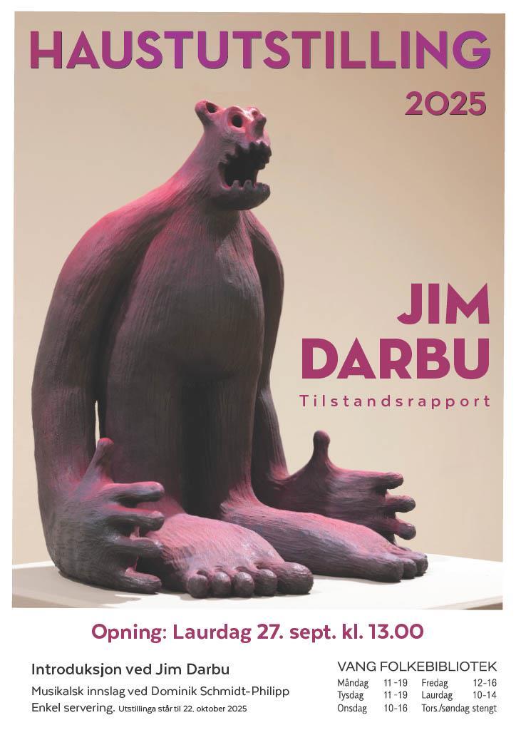 Velkomen til haustutstilling! I år er det Jim Darbu (f. 1981) som kjem til Vang. Kunsthandverkaren og kunstnaren syner skulpturar i ulike storleikar, og nokre måleri. Darbu er inspirert av teikneseriar. Han har ofte ei intuitiv tilnærming til kvart prosjekt og likar å utfordre seg sjølv i kvar einaste skulptur. Ideane kjem ofte opp som visuelle bilete i hovudet eller undervegs når han teiknar.